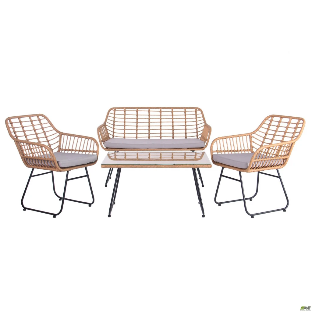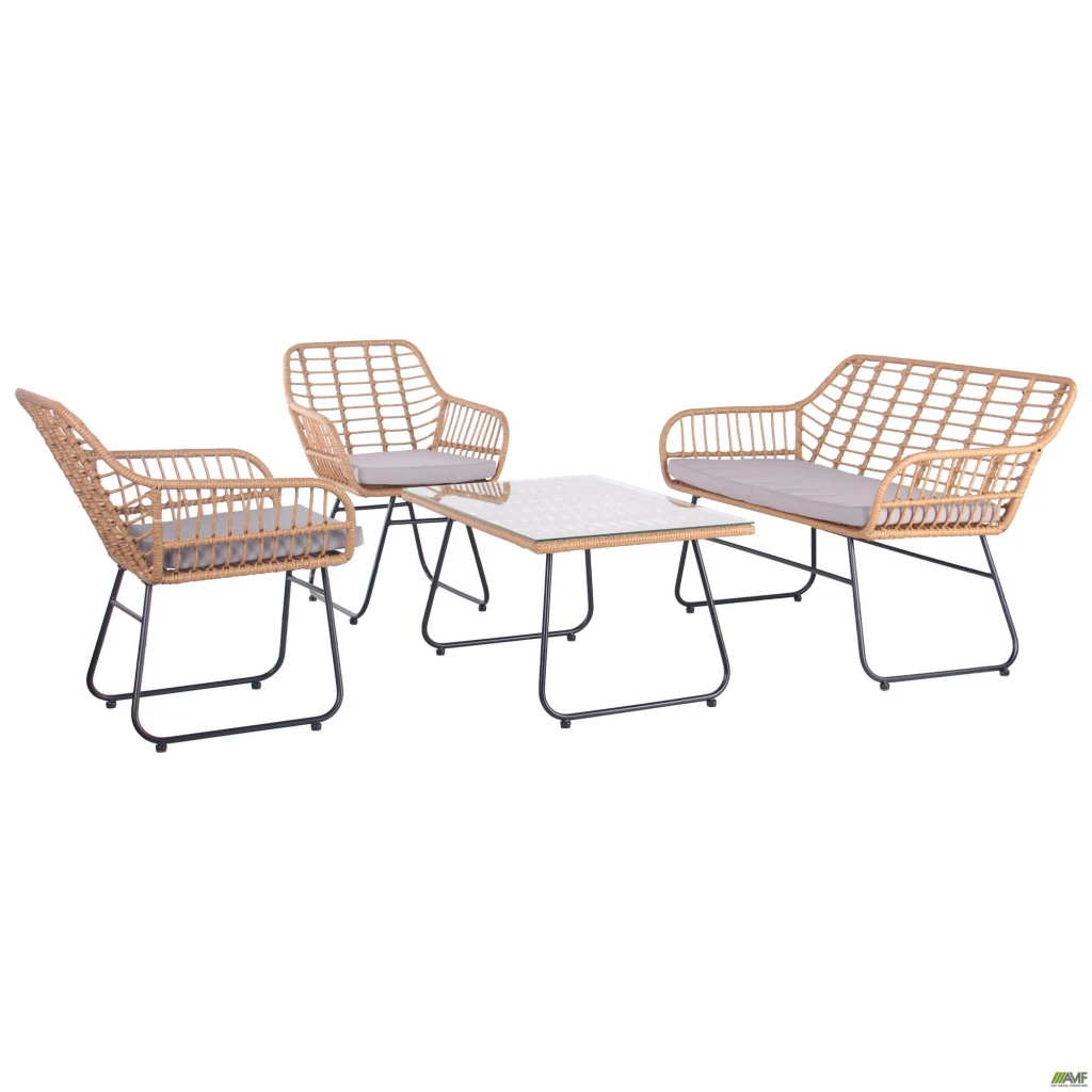 Комплект AMF Latino – чудовий варіант для літньої тераси. Комплект складається з: двох крісел, двомісного диванчика та кавового столика. Каркаси виробів виготовлені з металу та покриті порошковою фарбою. Сидіння та спинка виробів виконані з ротанга, який створює повітряне невагоме плетіння та не перешкоджає циркуляції повітря у спеку року. Додатково є подушки на сидінні дивана та крісел, які забезпечать максимальний комфорт. Стільниця столика виконана з розжареного скла, товщиною 5 мм. Комплект AMF Latino стане вашим незамінним помічником під час щоденного ранкового чаювання.