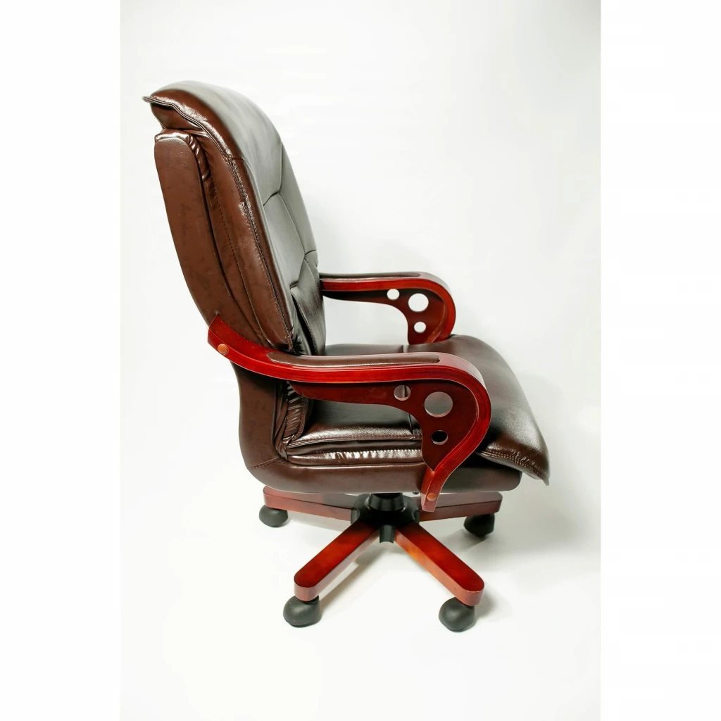 Модель оснащена подлокотниками и крестовиной с натурального дерева.