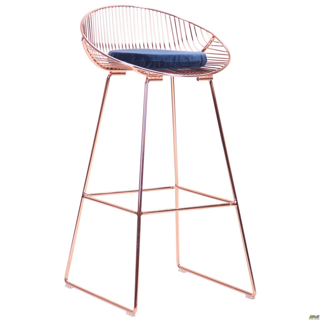 Компактний і високий барний стілець AMF Chik гармонійно впишеться під барну стійку, роблячи приміщення стильним і сучасним. Каркас стільця виконаний з тонких металевих прутів, що рівномірно утворюють спинку. Сталеві ніжки для стійкості з'єднані міцним сталевим прутом. Стілець має м'яку накладку на сидіння блакитного кольору, яка красиво поєднується з металевими елементами унікального кольору Rose Gold. Подушка сидіння зйомна.