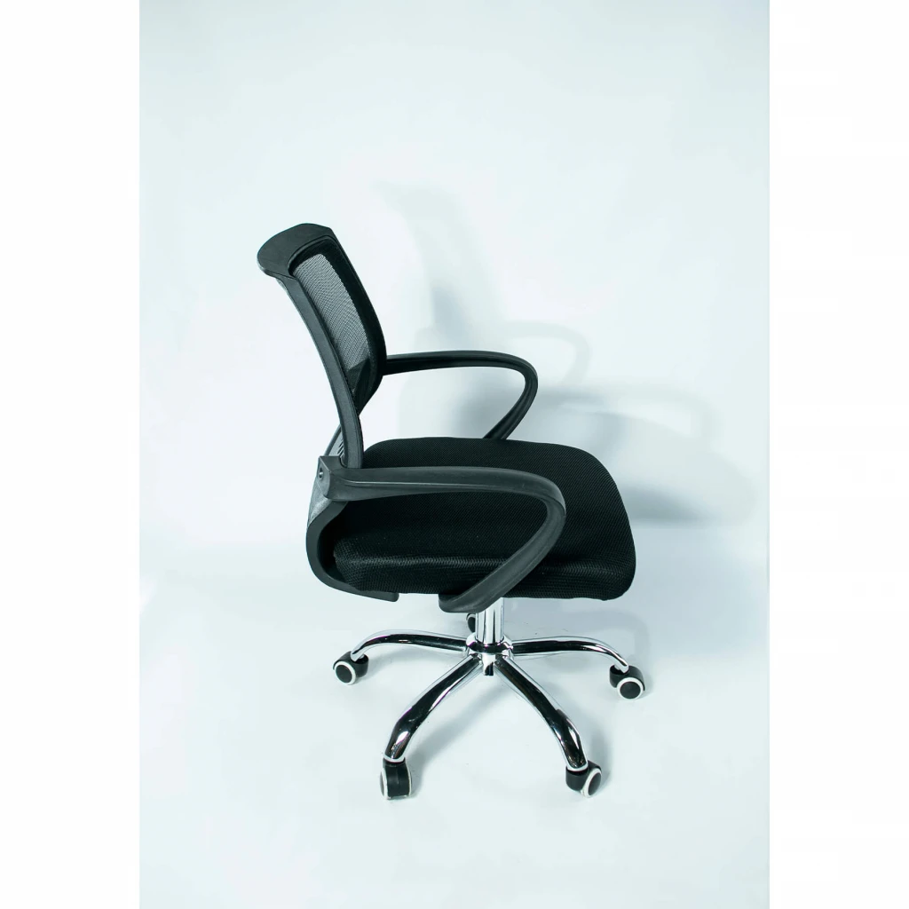 Супер крісло з невисокою ергономічною спинкою з прогином у ділянці нирок. Оббивка - повітропроникна нейлонова сітка, міцна та комфортна. Зручні оригінальні підлокітники виконані із міцного пластику.