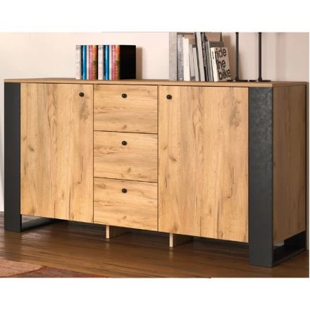 Модульная мебель гостиной Олд Вуд - настоящая находка для любителей адаптаций в популярном стиле «лофт». Декоративные черные планки, способны выгодно скорректировать высоту помещения. Контрастность приятной текстуры древесины в декоре «дуб крафт золотой», и белое свет подсветки стеклянных витрин, сбалансирует дизайн и подарит уют Вашей гостиной. отовлении корпусов и фасадов используется качественное ЛДСП. Аккуратные ручки черного цвета удобные и идеально вписываются в общий характер мебели.
