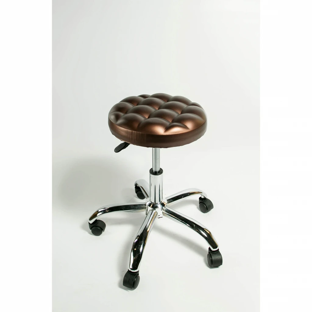 Крісло табурет на коліщатках для майстра з регулюванням висоти. Стілець виконаний з м'яким сидінням із хромованим металевим каркасом. Коліщата виконані з пластику з м'яким ходом. Висота стільця регулюється.